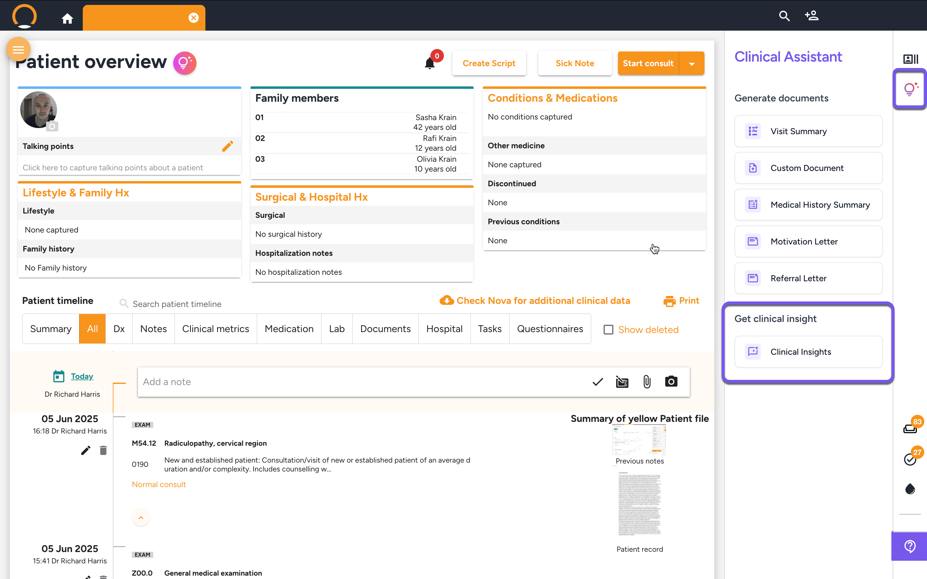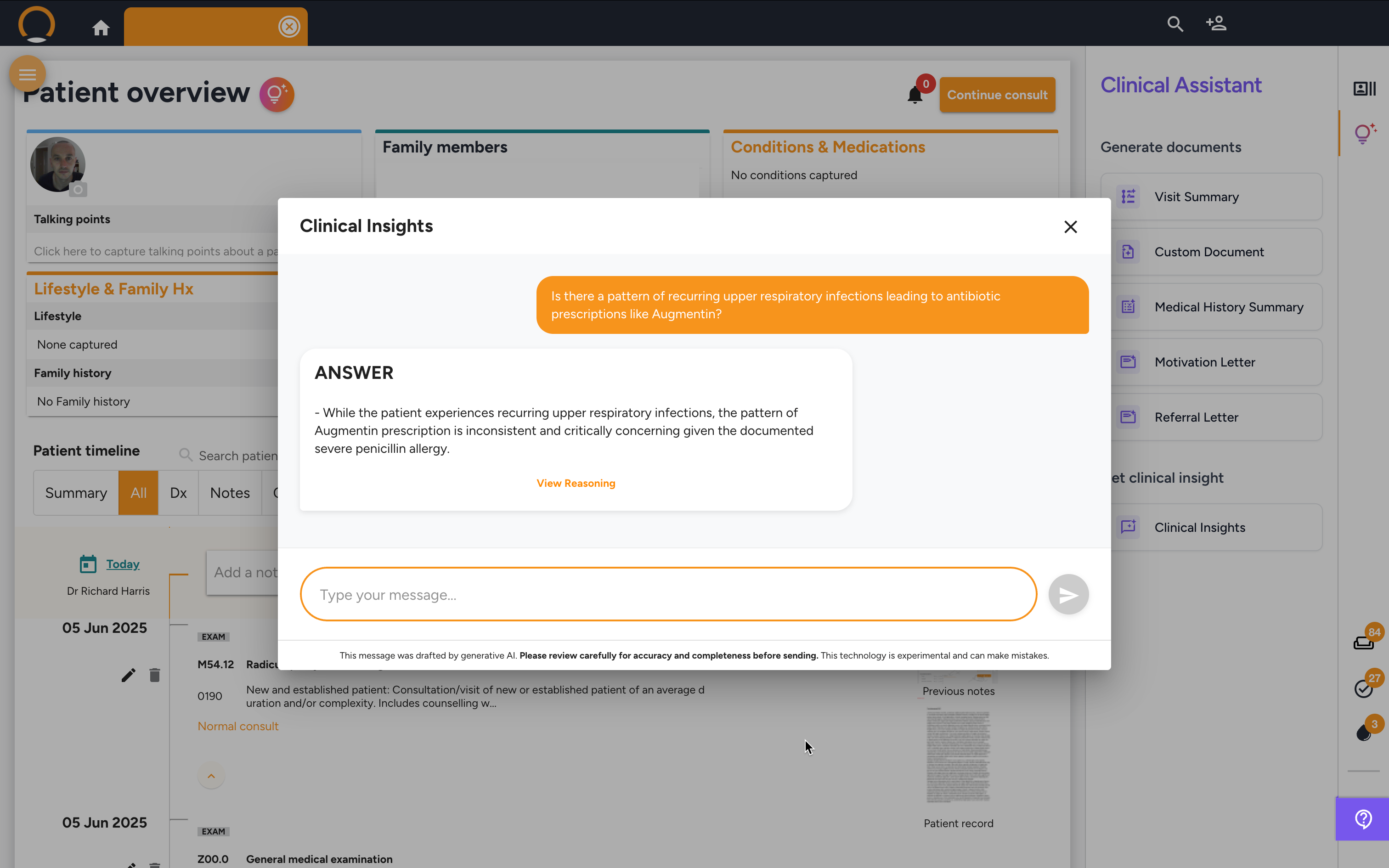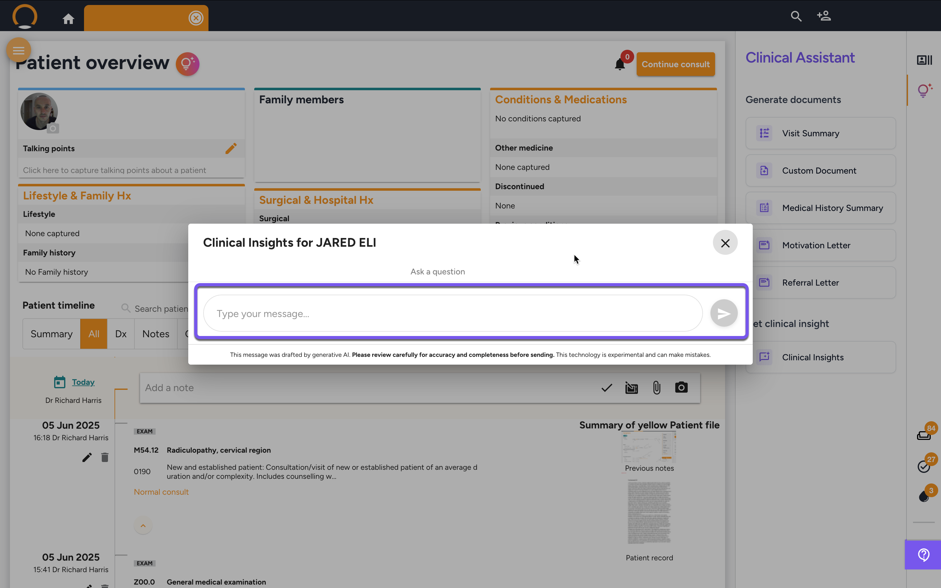 Q: Will it give me a diagnosis or tell me what to do? A: No. Clinical Insights is a data analysis and retrieval tool, not a diagnostic one. It synthesises the information you have already recorded to answer your questions. It acts as your "second set of eyes" on the patient's history, but the clinical decision-making always remains with you, the doctor.