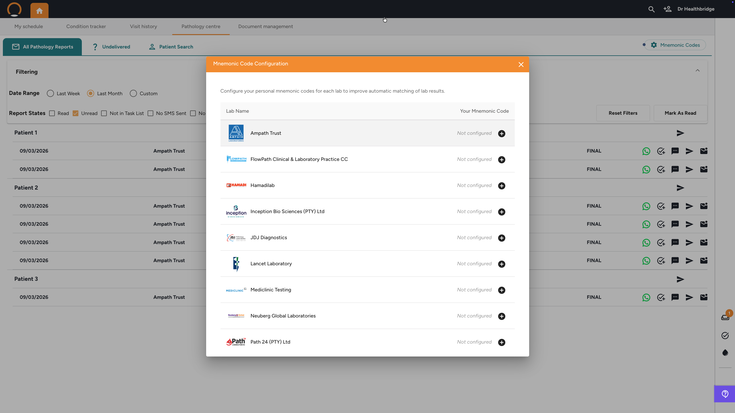 The Mnemonic Code Configuration popup will appear, listing all major labs (e.g., Ampath, Lancet, Path 24).