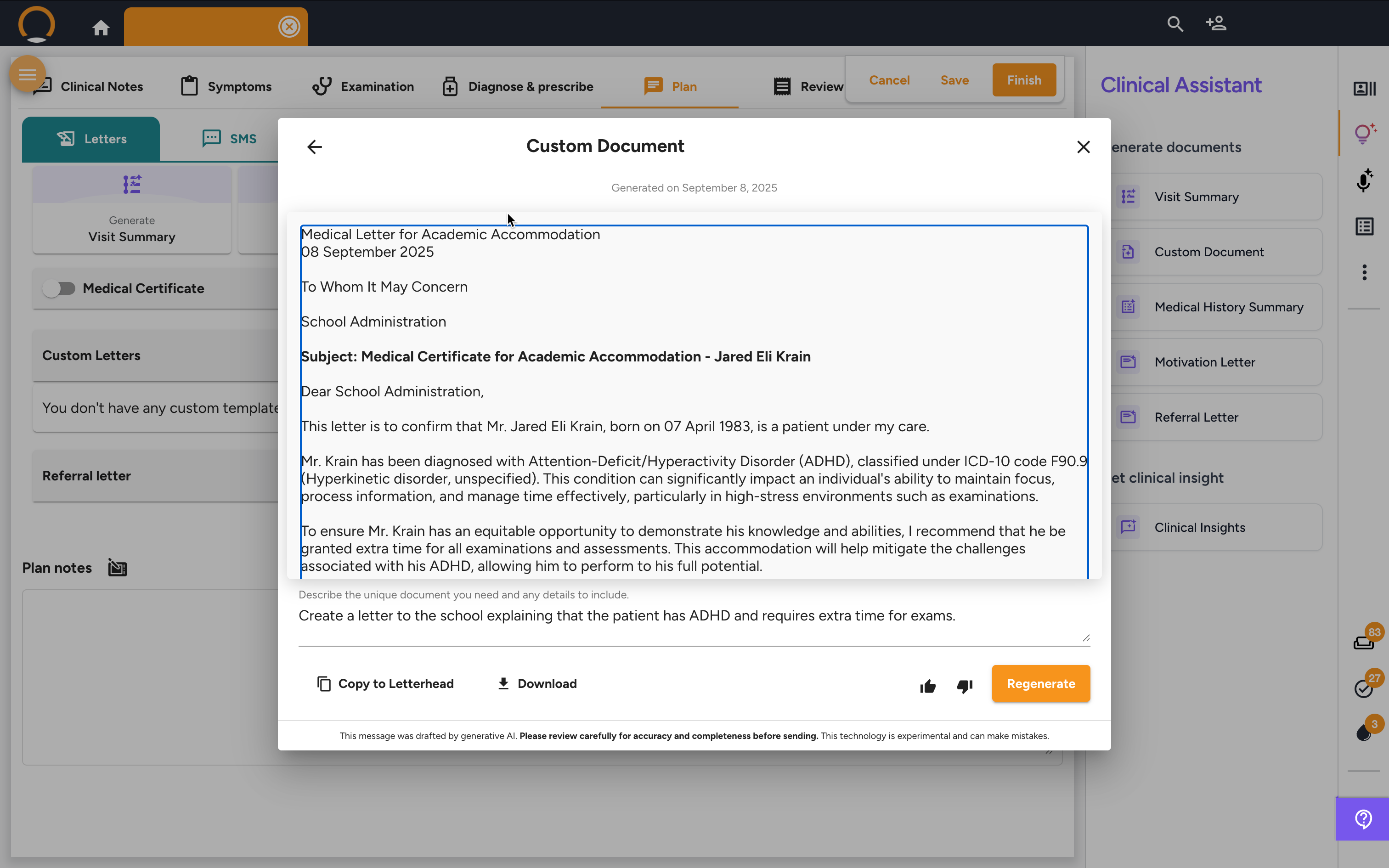 - "Create a letter to the school explaining that the patient has ADHD and requires extra time for exams."