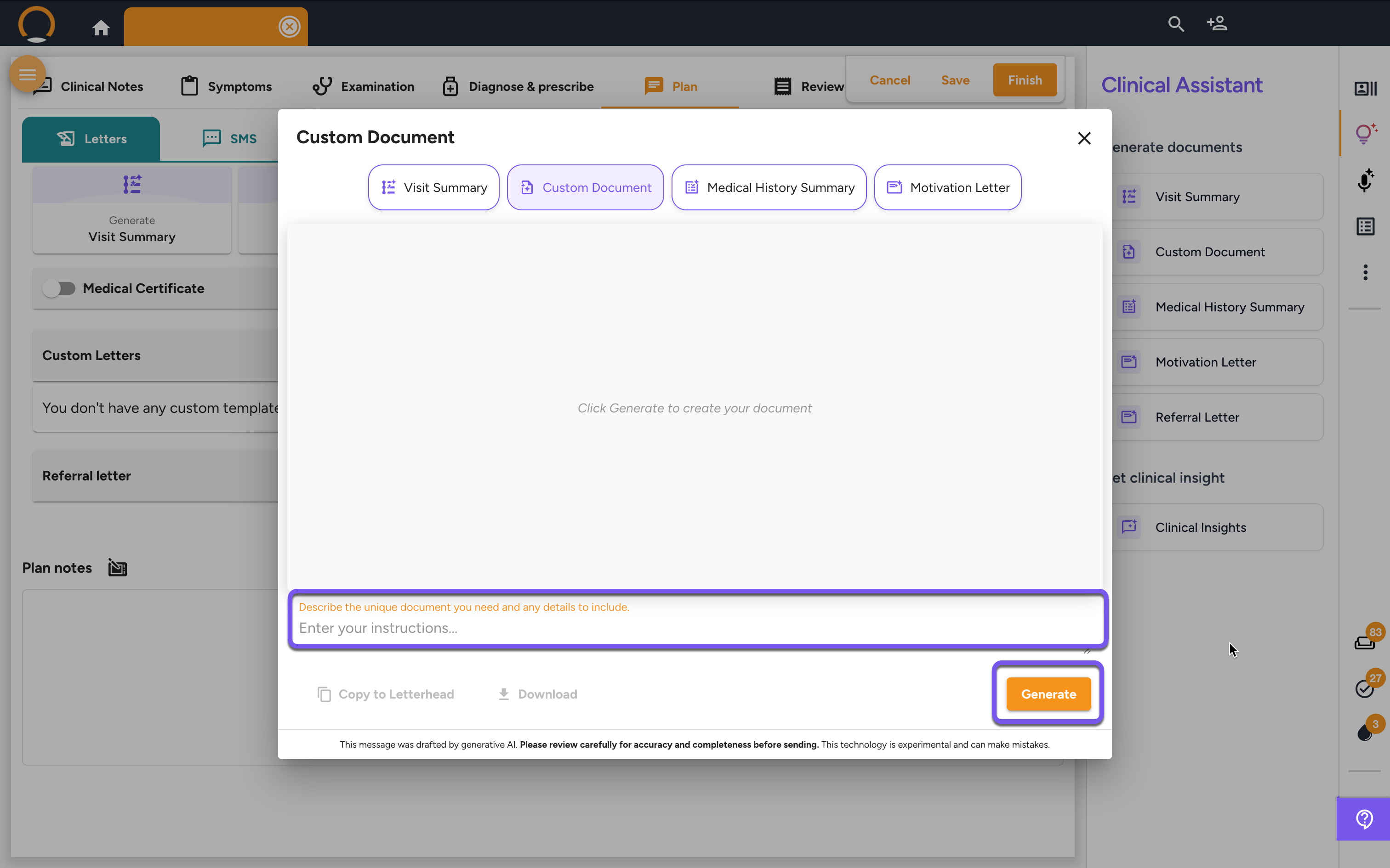 Proceed through the consultation steps until you reach the "Plan" tab. Under the "Letters" section, click on "Generate Custom Document".