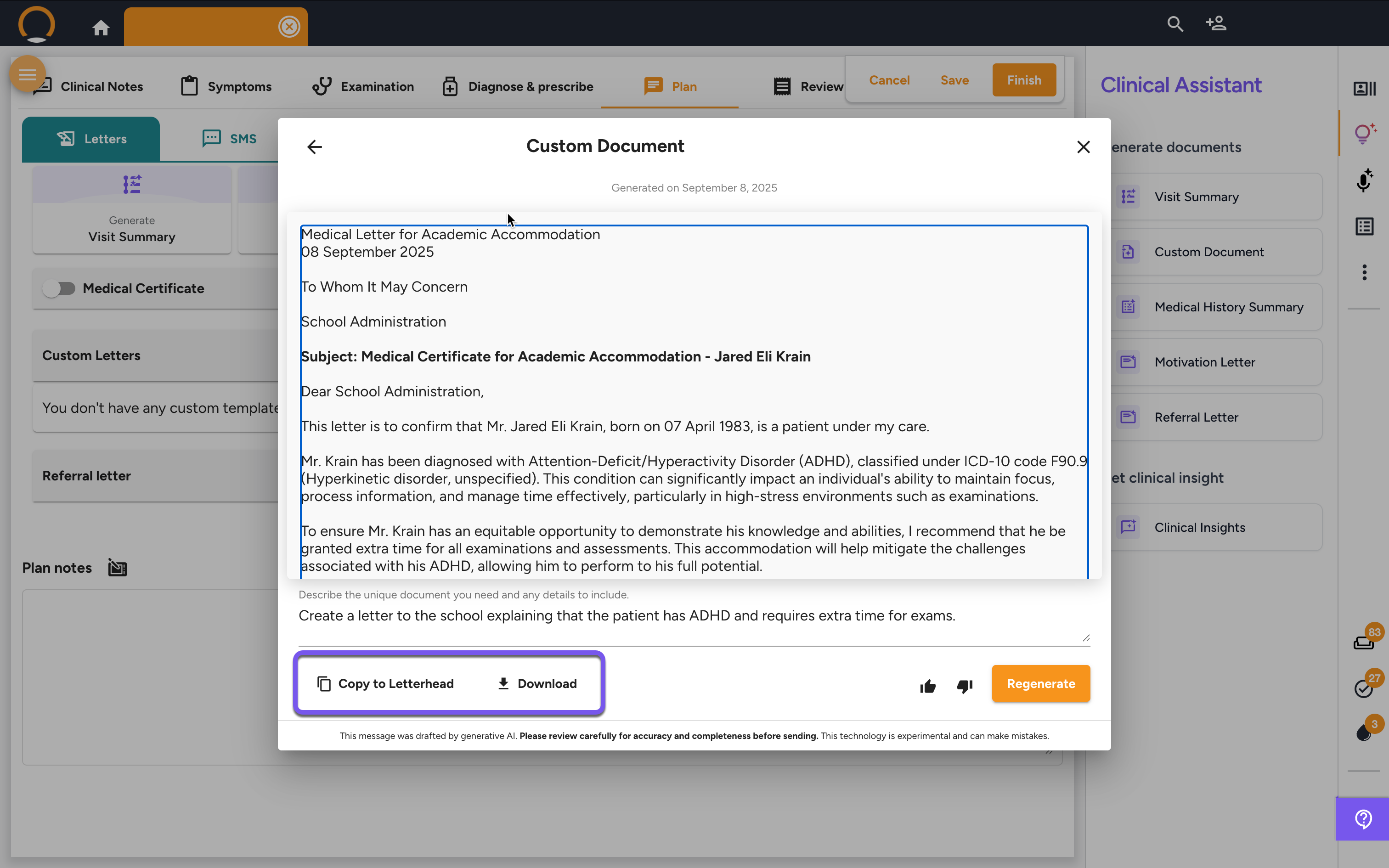 Refine (Optional): If the document needs changes, you can add further instructions in the text box at the bottom (e.g., "Make the tone more formal" or "Include the dates of their last three visits") and click "Regenerate".