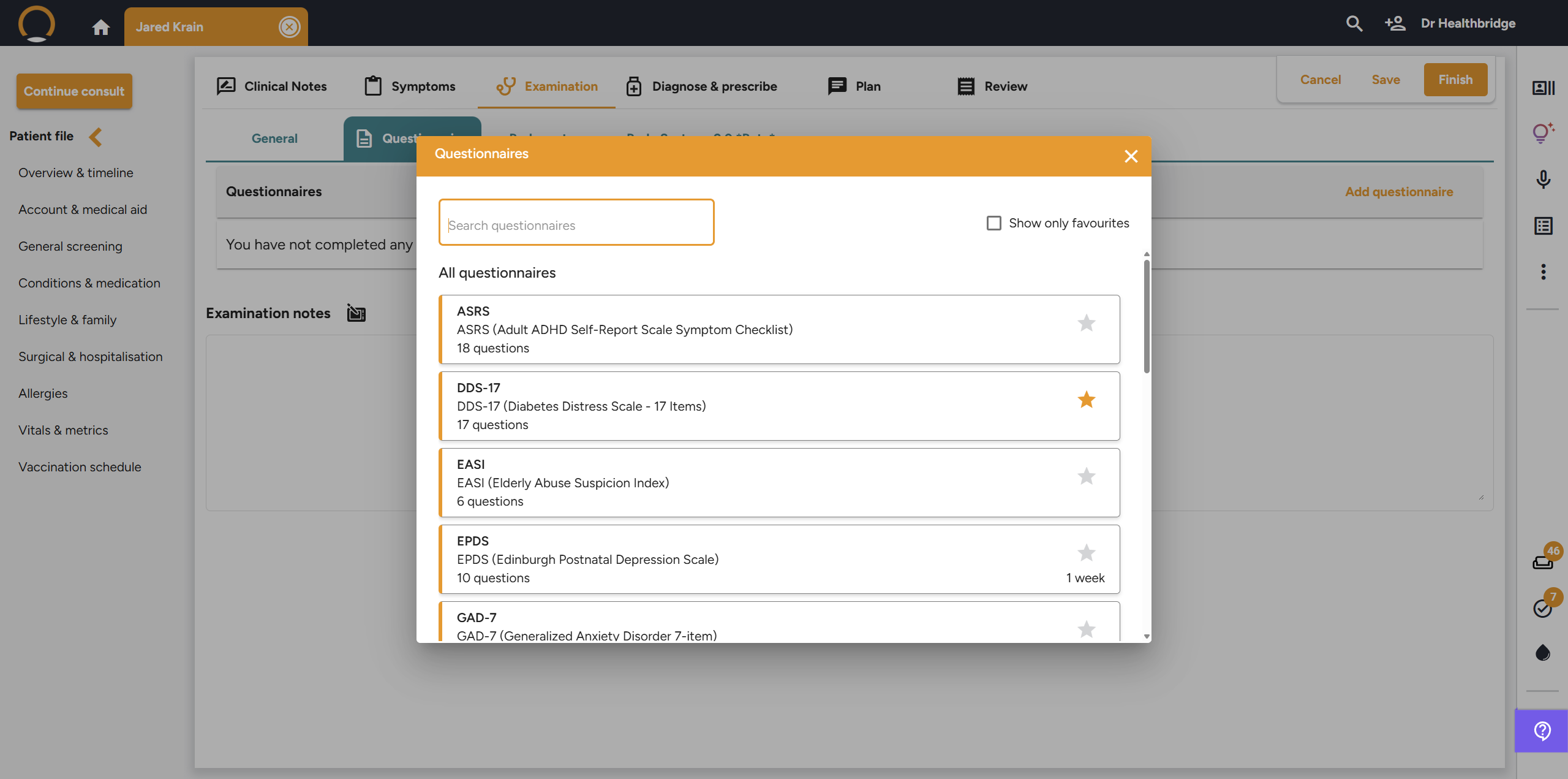 Tip: Click the Star icon next to a questionnaire to add it to your Favourites for quicker access in future consults.