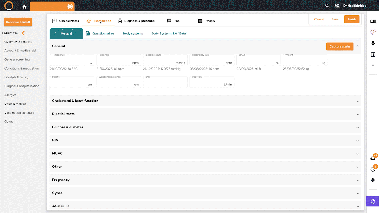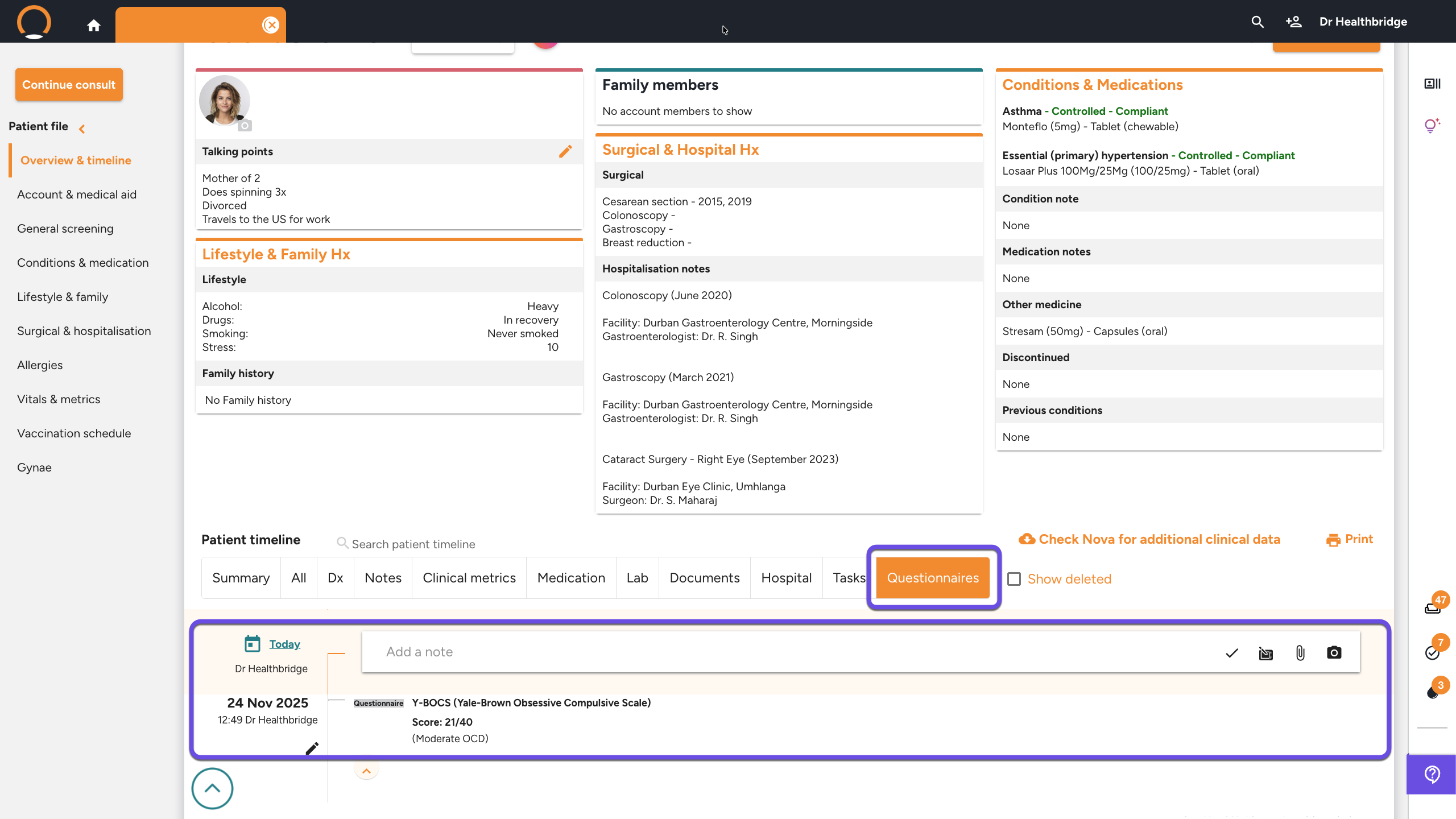 - Clinical Traceability: Completed questionnaires are automatically stored in the Patient Timeline, providing a clear audit trail of clinical decision-making.