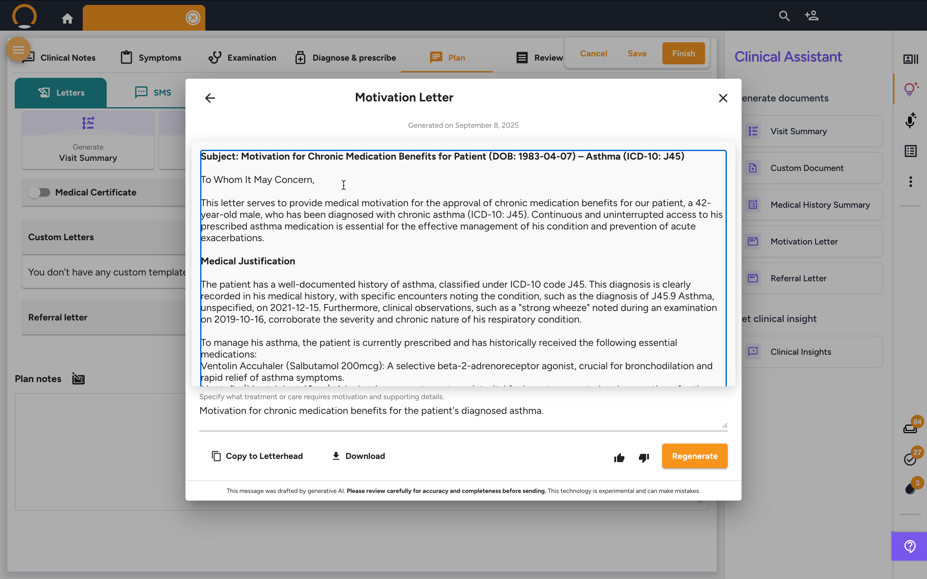 Refine (Optional): If the letter needs changes, you can add further instructions in the text box at the bottom (e.g., "Include the results from the lab test on June 5th") and click "Regenerate".