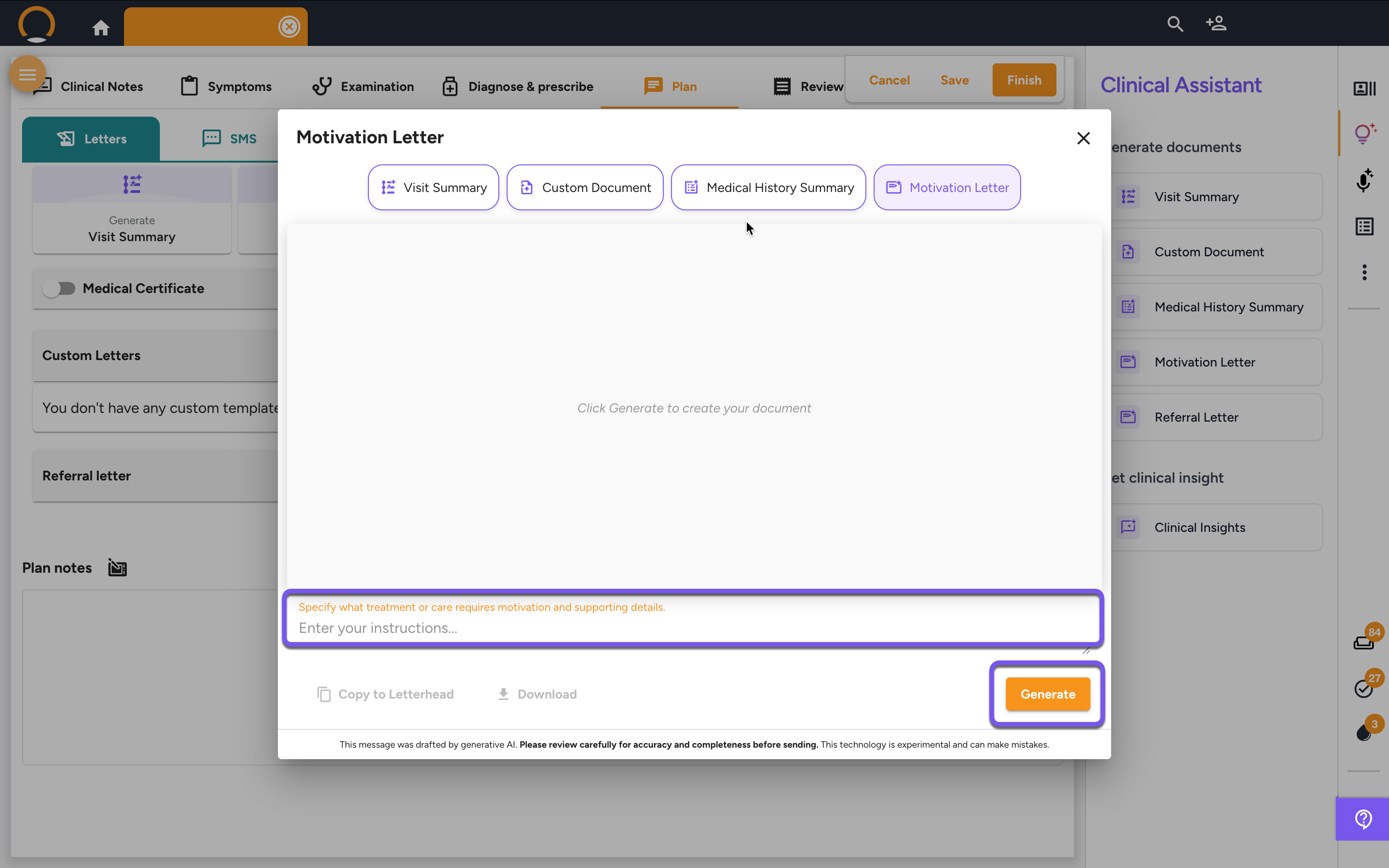 Proceed through the consultation steps until you reach the "Plan" tab. Under the "Letters" section, click on "Generate Motivation Letter".