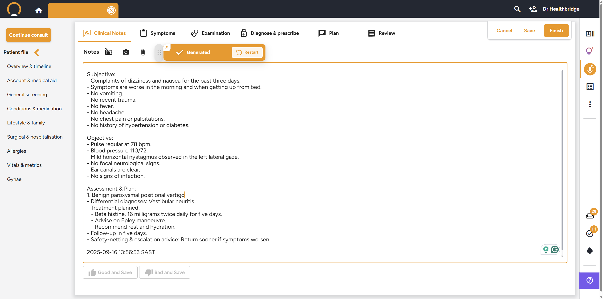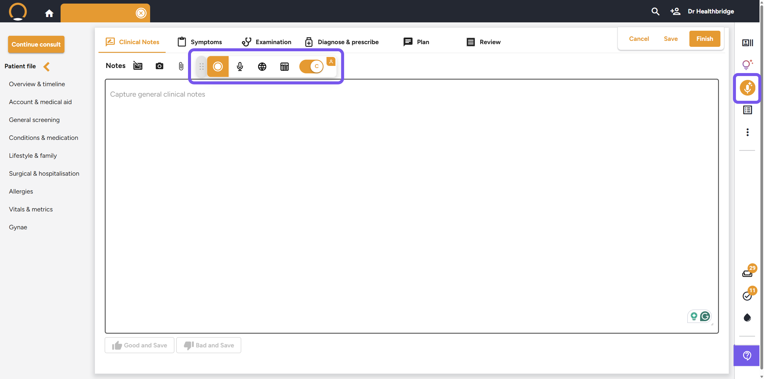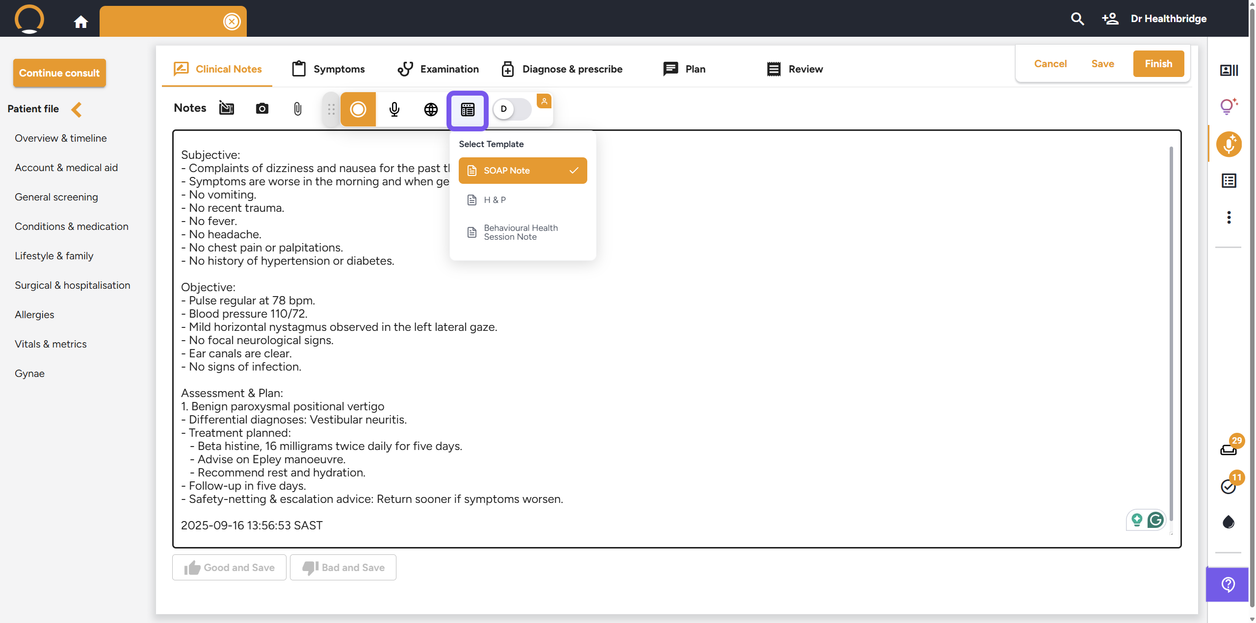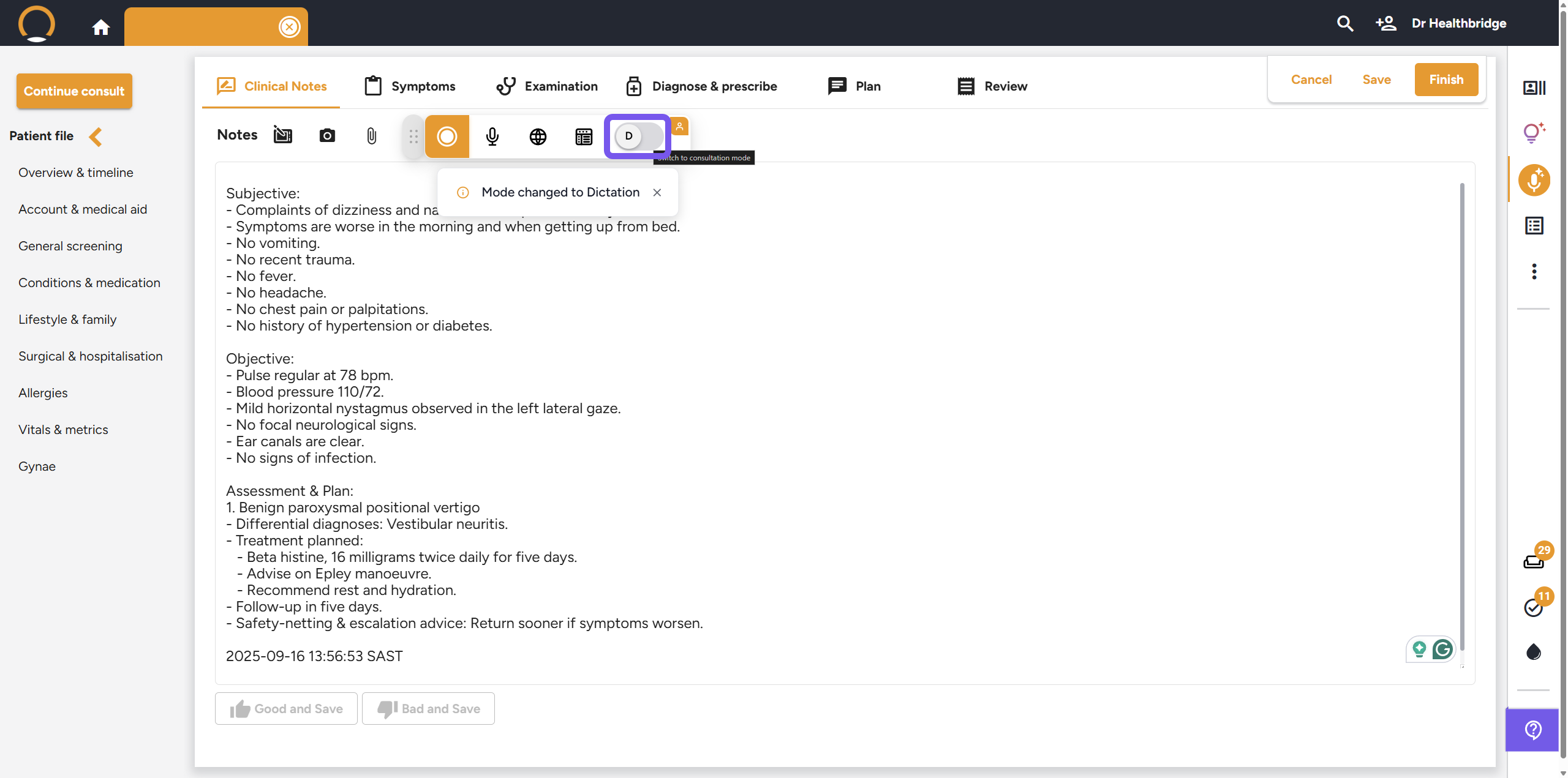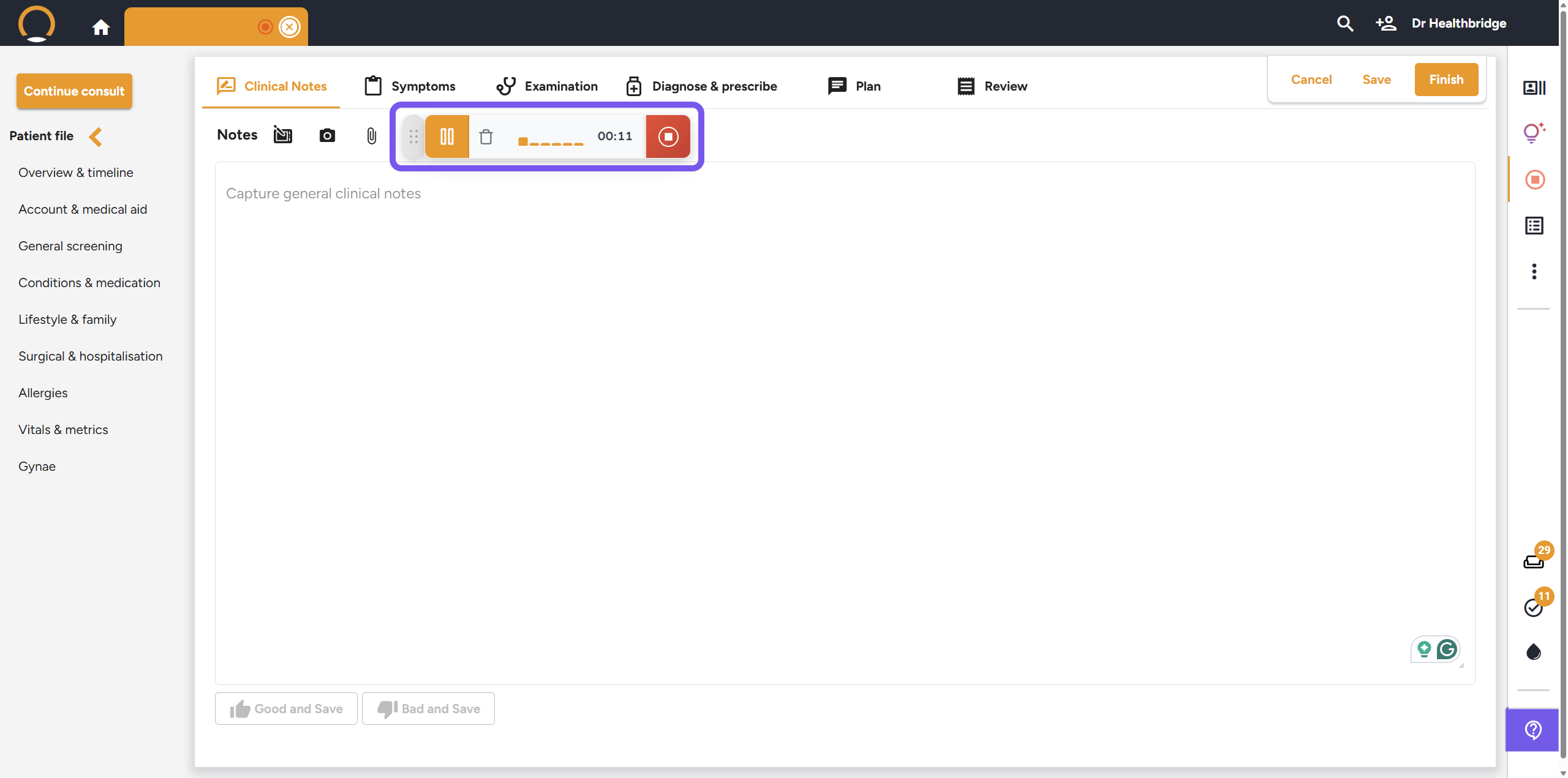 With Dictation mode, clinicians can dictate a summary or key points from the consultation (limited to 3 minutes), and Nora will turn that into structured notes. It’s ideal for quick recaps or when a clinician prefers to speak their notes after the fact.