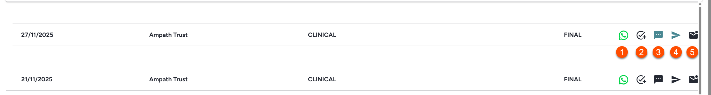 - Send SMS (Message Bubble Icon): Notifies the patient of their results via SMS. Teal indicates an SMS has been sent, and hovering reveals the date.