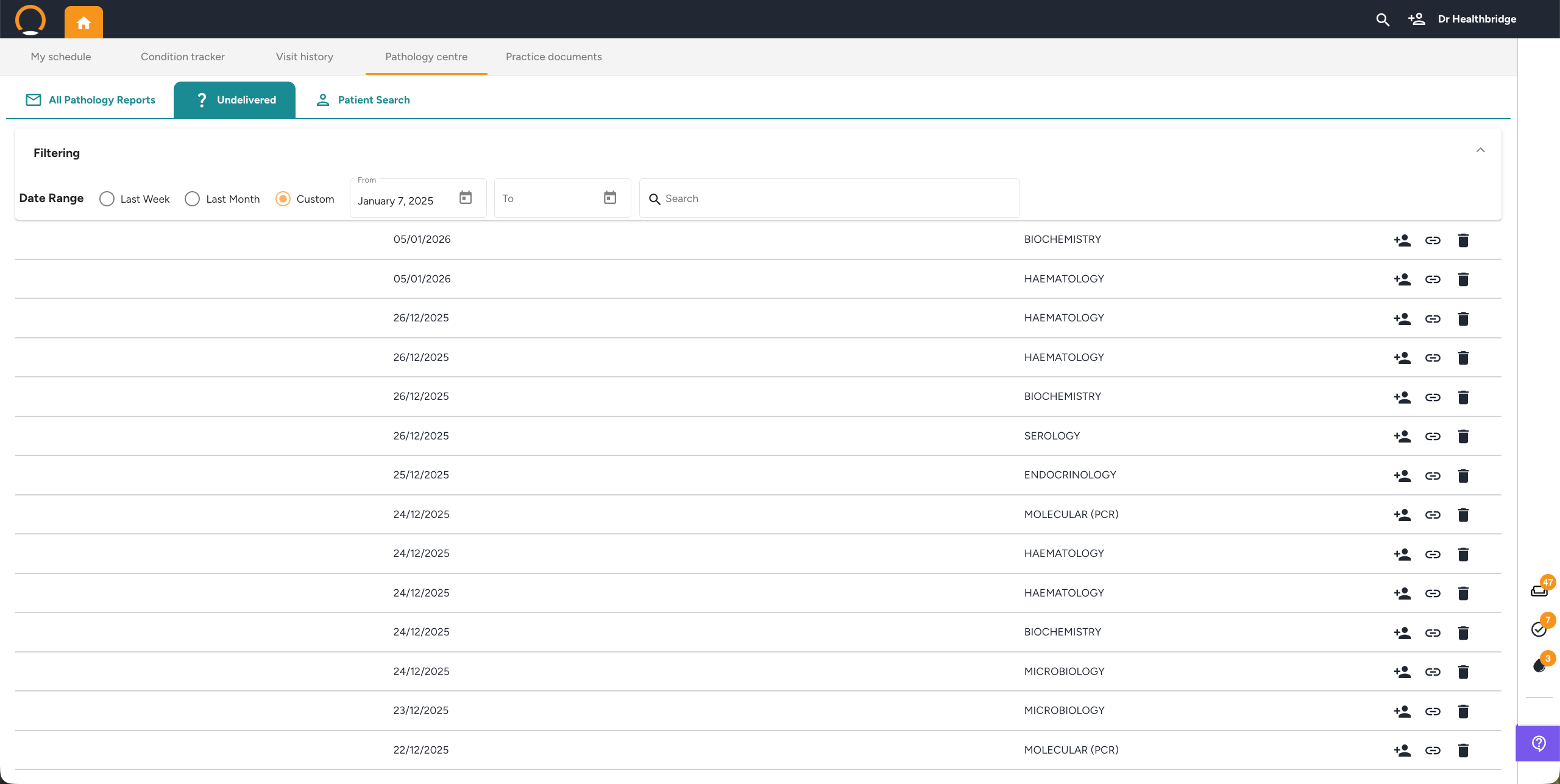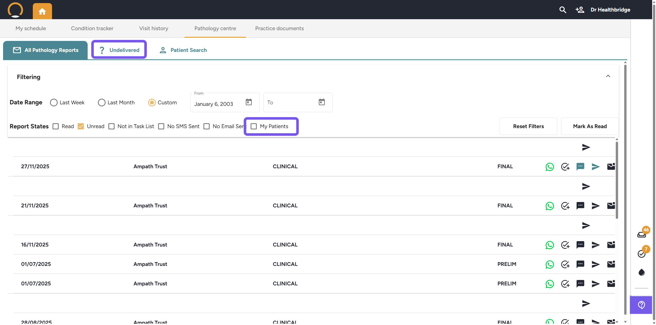 In Healthbridge Clinical, the Undelivered tab in the Pathology Centre acts as a safety net for your practice. It ensures that no laboratory report is overlooked, even if the system cannot automatically match it to a specific patient file.