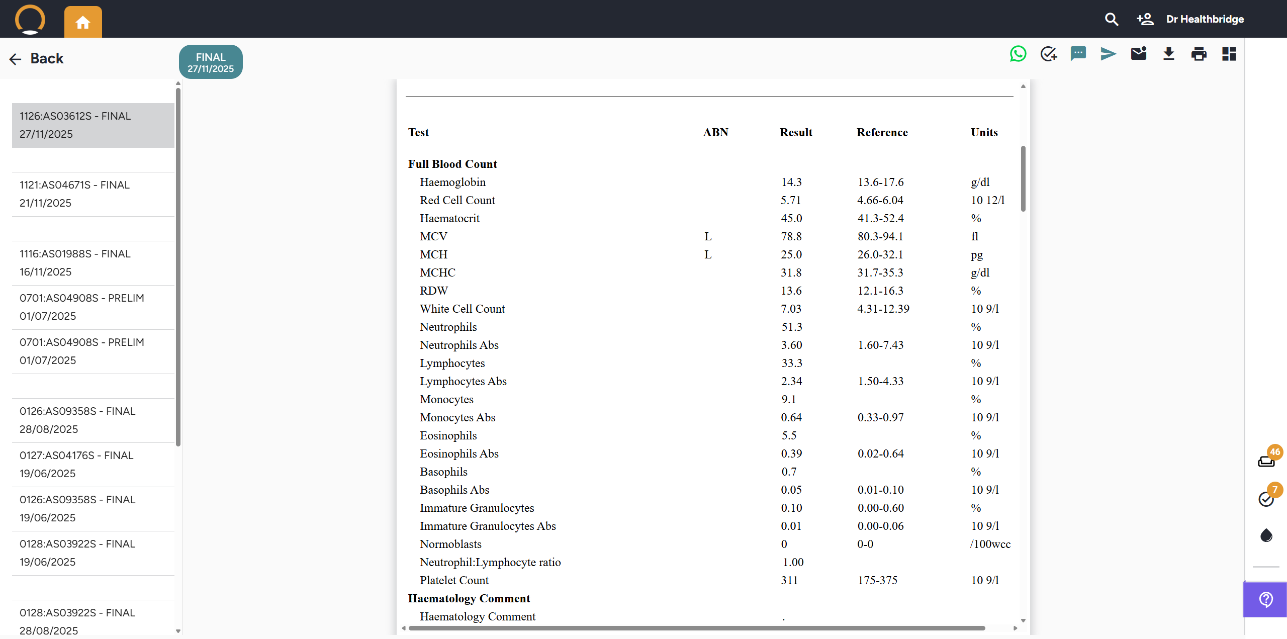 - Send Email (Paper Plane Icon): Emails the laboratory report directly to the patient or a colleague from within the system. Teal indicates the email has already been dispatched.