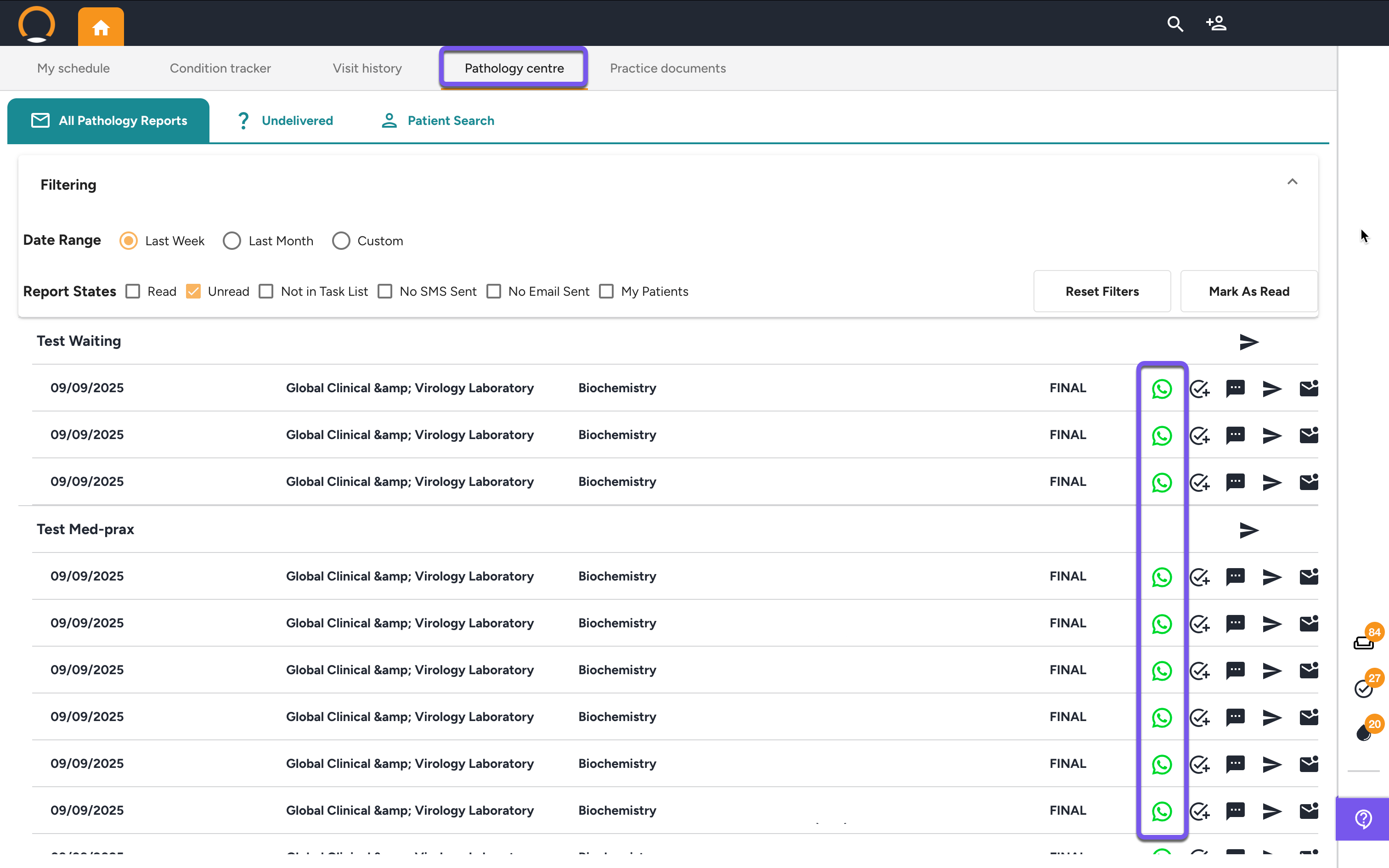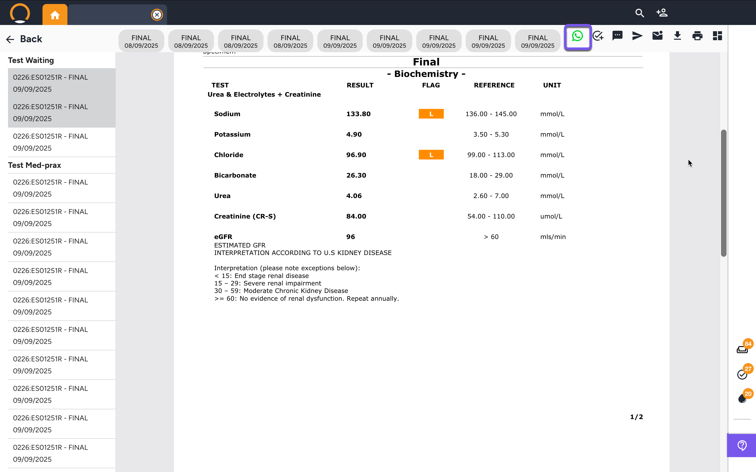 In the top right-hand corner of this screen, click the green "Send WhatsApp with AI" button (the WhatsApp icon). This will launch the AI Pathology Messenger.