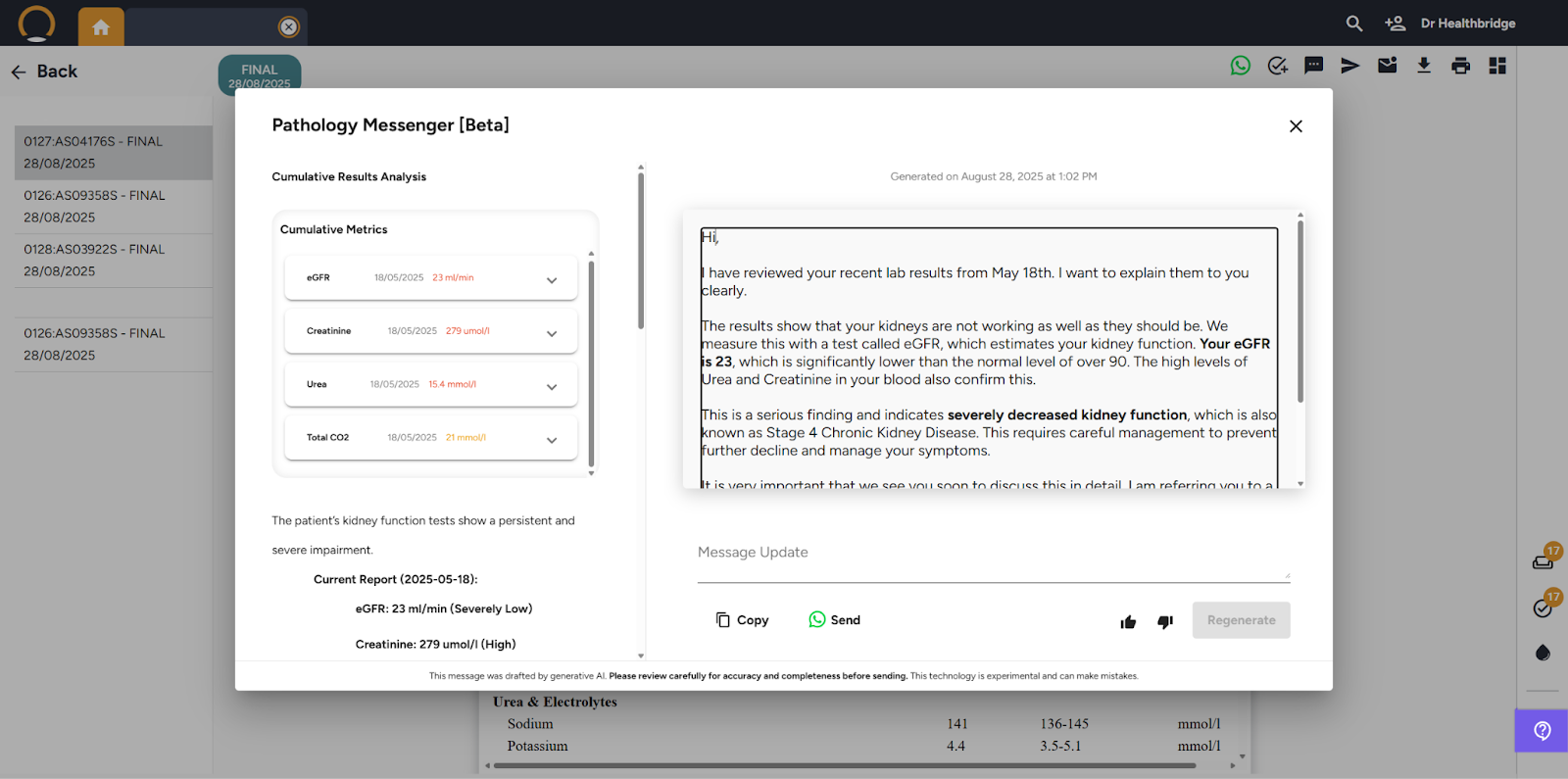Right Panel (Patient Message): This side contains the clear, patient-friendly WhatsApp message that the AI has drafted. It explains the results in simple terms and provides actionable next steps.