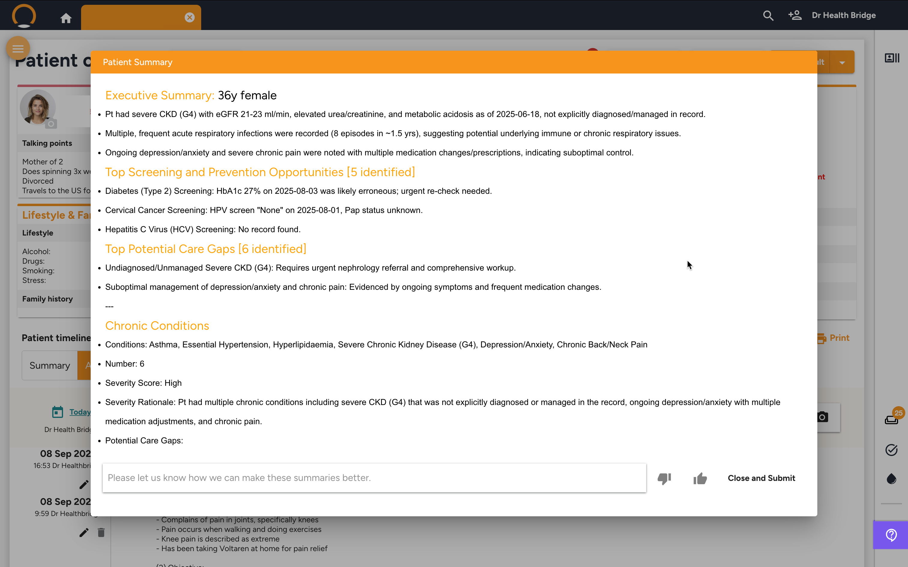 Q: How is this different from just reading the patient's timeline? A: The patient's timeline is a raw, chronological list of every event. The AI Patient Summary actively synthesizes and analyzes this data, identifying patterns, highlighting the most critical issues, and flagging potential care gaps that might be missed during a quick manual scan. It provides clinical insight, not just a list of information.