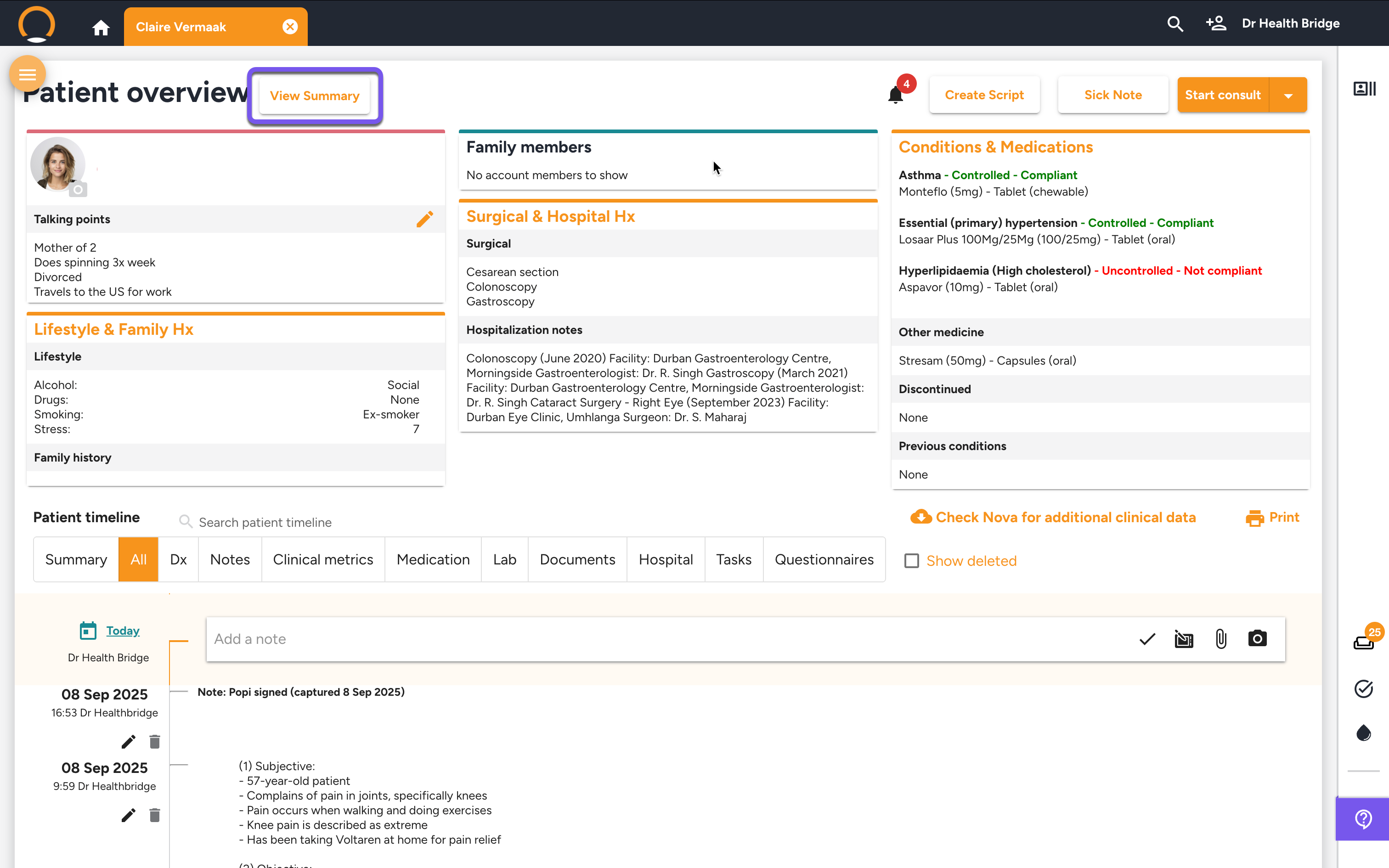 The Patient Summary is designed to be used before you start a consultation to quickly get up to speed.
