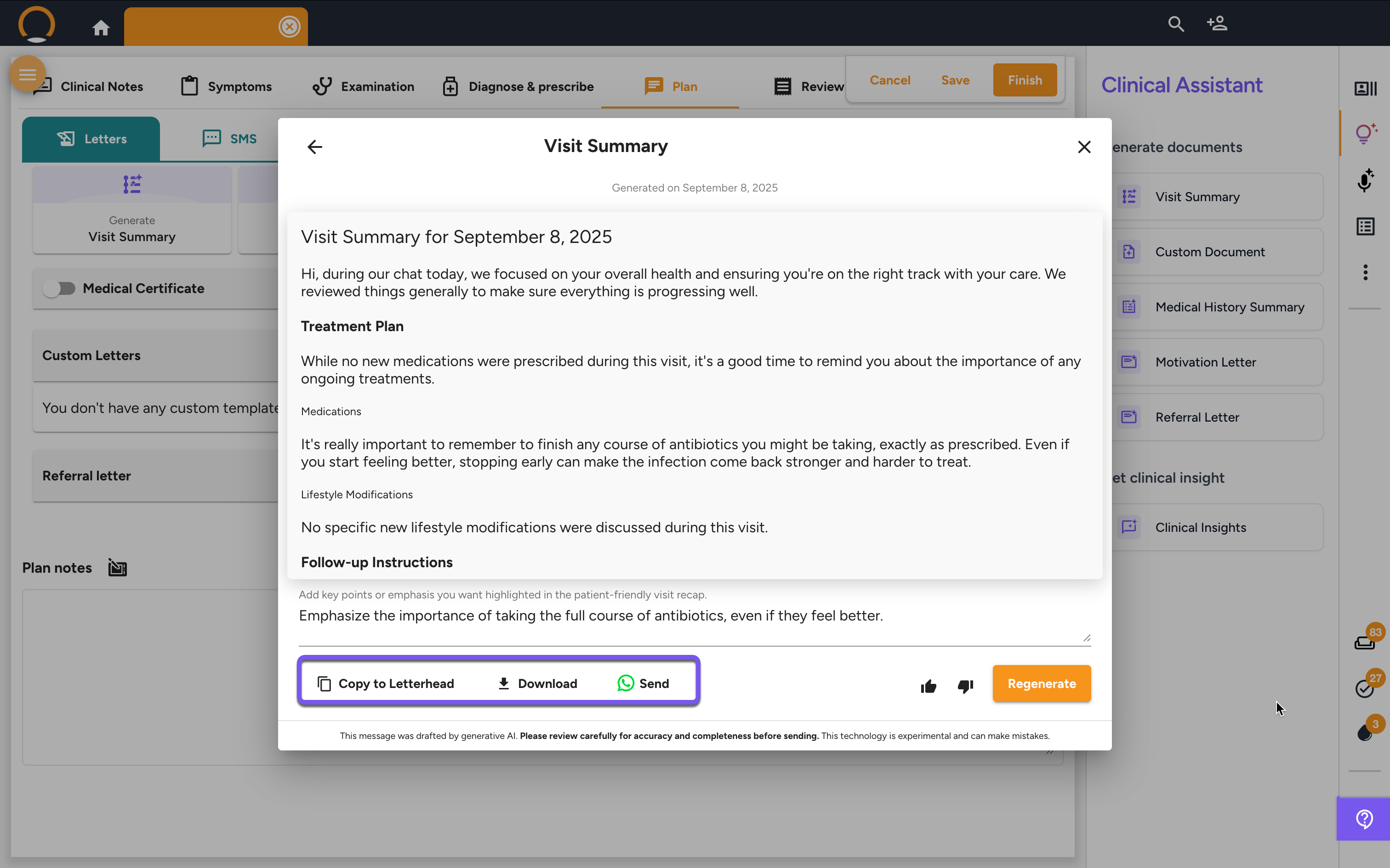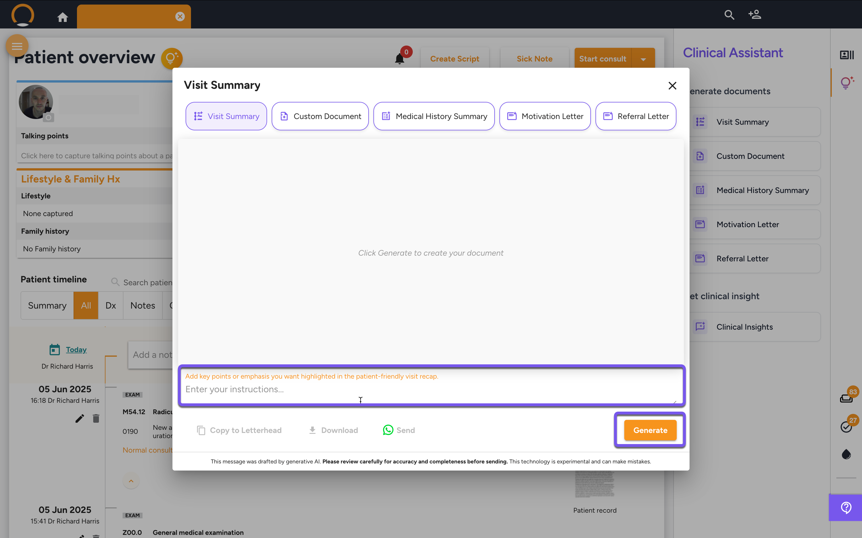 Q: Can I control what the summary says? A: Yes. The AI generates a comprehensive draft based on the consultation, but you have full control. You can provide specific instructions before generating it to emphasize key points (like taking medication), and you can edit the text afterward to add your own personalized advice.