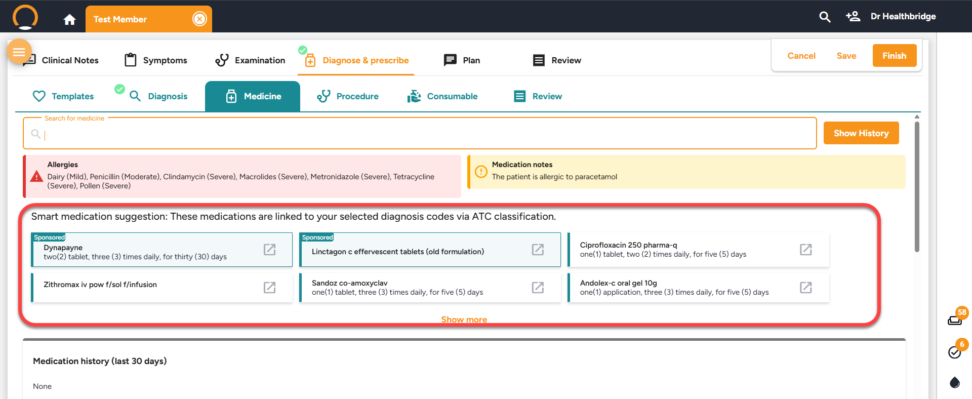 • Suggested medications - A section heading"Smart Medication Suggestions" has been added These medications are associated with the chosen diagnosis codes through "ATC classification." This section appears only when a diagnosis has been recorded.