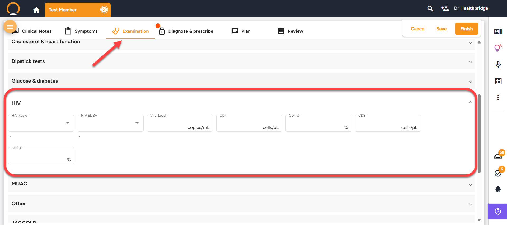 • Examination Tab Updates - A new field for "peak expiratory flow" has been added for lung function monitoring, and the Hemoglobin readings now can be recorded under the "other" of the general examination.