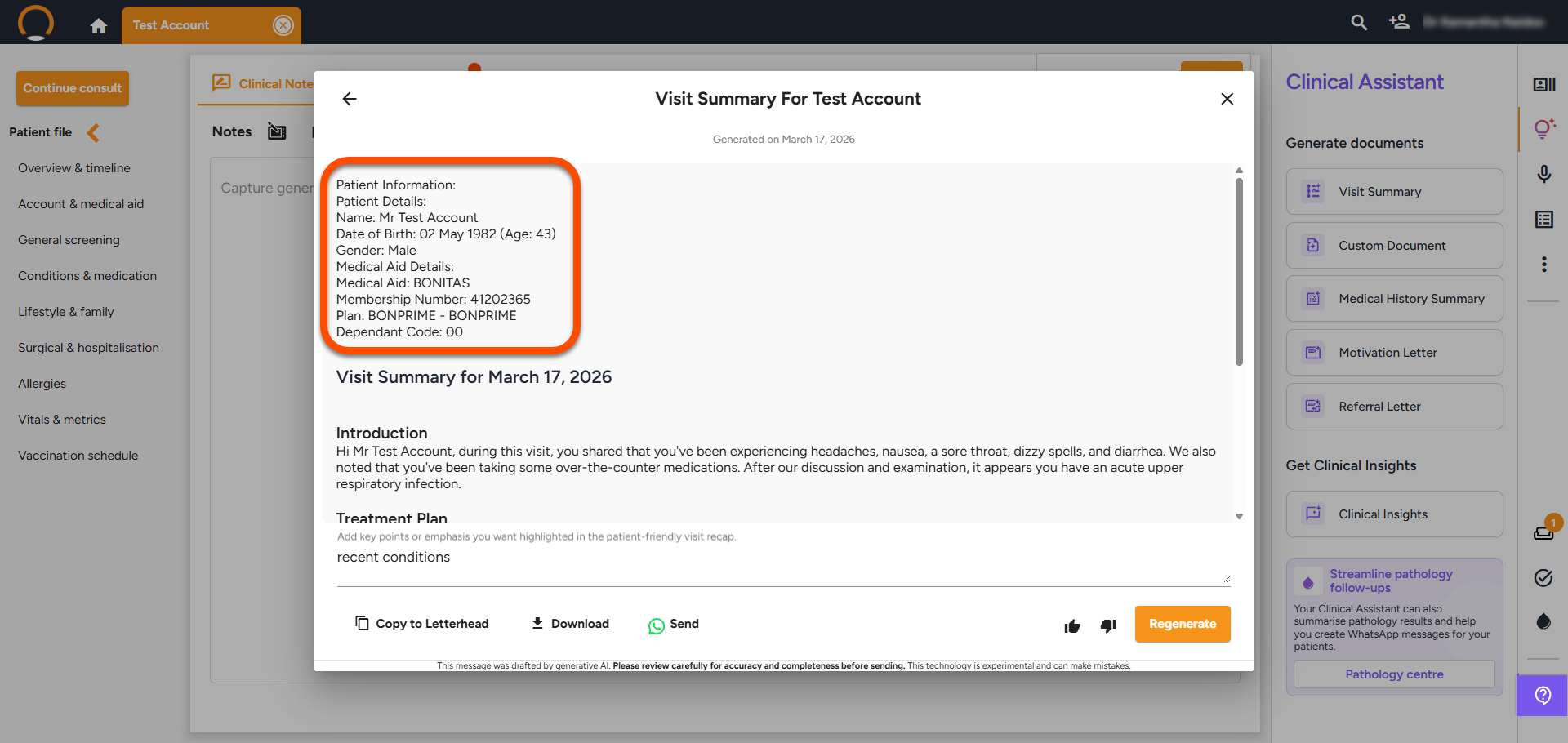 • Clinical Assistant Documents -Clinical Assistant's AI-generated documents now incorporate a standardized "Patient Details" section. This includes patient demographics and, where relevant, a Medical Aid Details section. This update is applicable across all document types, such as Visit Summaries and Referral Letters.