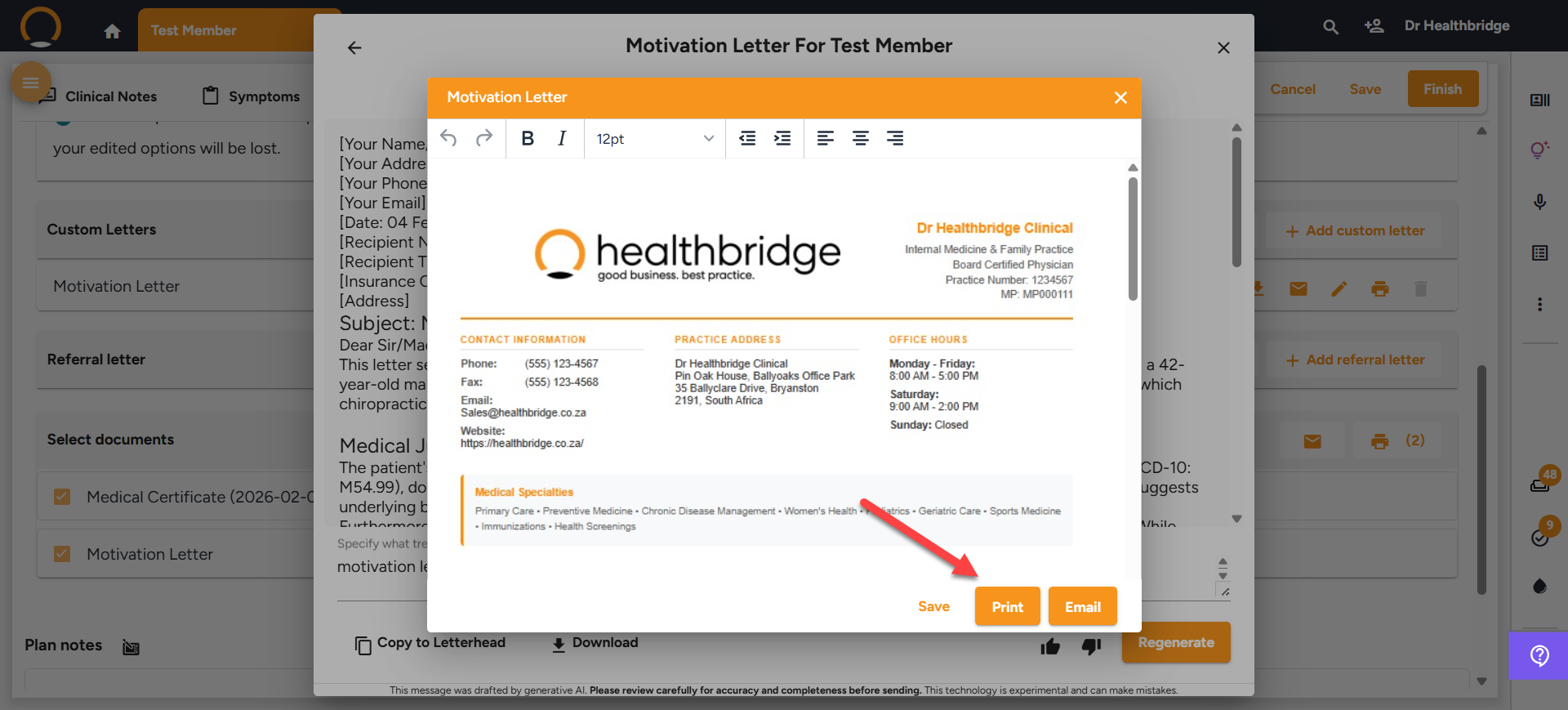 • Document Generation: Visit summaries, referral letters, motivation letters, and medical history summaries now integrate seamlessly with professional letterheads featuring practice branding.