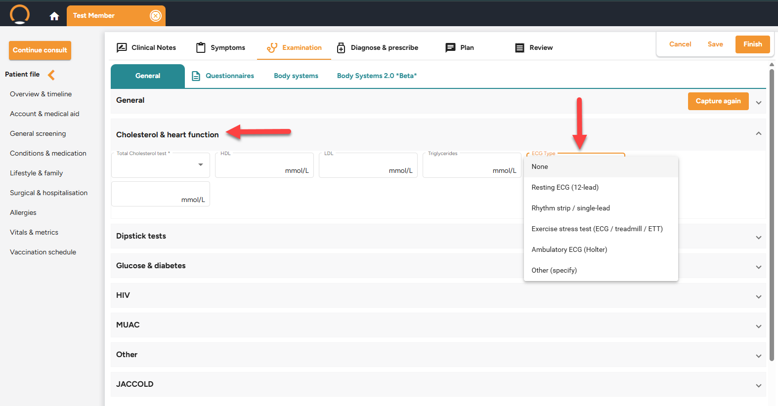 • ECG Capture Enhancement (Structured Clinical Input) - The ECG section within the Cholesterol & Heart Function category has been enhanced from a single free-text entry to a structured, type-specific data capture system.